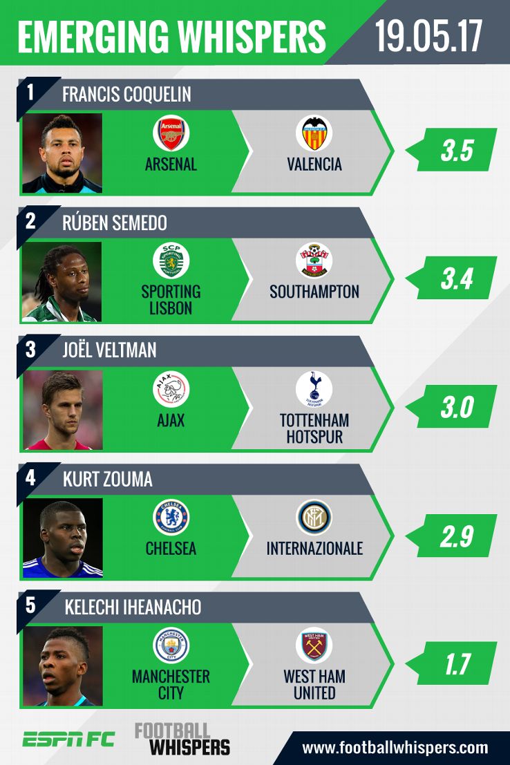 Here are today's top five emerging whispers for the summer. And keep an eye on Transfer Talk for all the latest gossip.